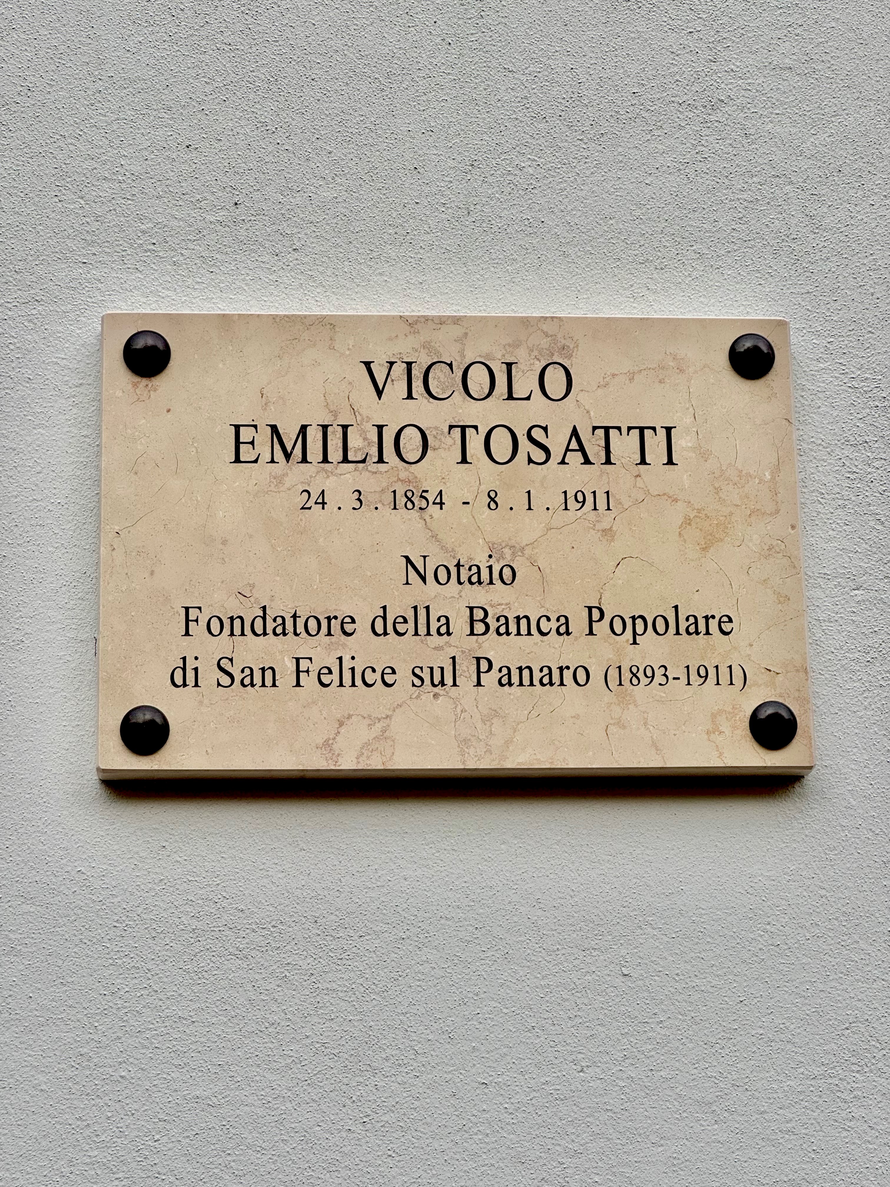Giovedì 13 novembre 2025 è stato inaugurato a San Felice sul Panaro un nuovo vicolo intitolato a Emilio Tosatti, fondatore della SANFELICE 1893 Banca Popolare.